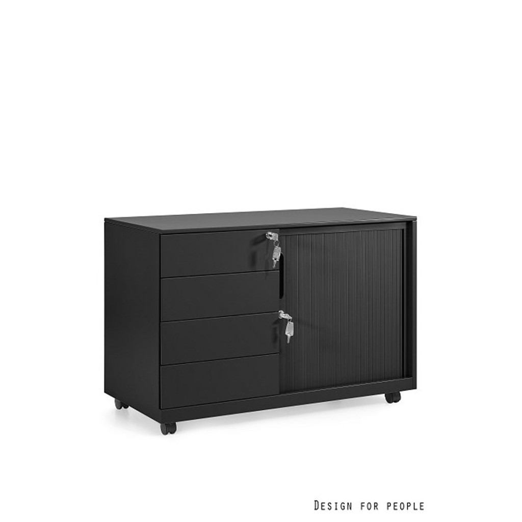 A szekrényrész tartós ABS műanyagból készült redőnyös ajtóval van felszerelve. Ez a megoldás rendkívül helytakarékos, mivel kinyitáskor nem igényel extra teret a szekrény előtt, így szűkebb folyosókon vagy kisebb irodákban is ideális. A szekrényrész természetesen biztonsági zárral védett.