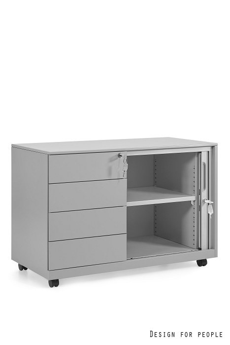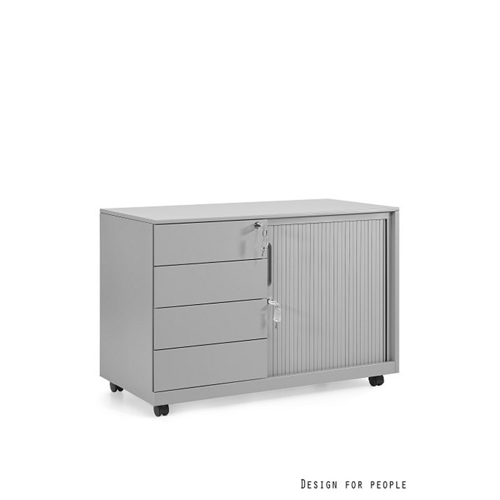 A szekrényrész tartós ABS műanyagból készült redőnyös ajtóval van felszerelve. Ez a megoldás rendkívül helytakarékos, mivel kinyitáskor nem igényel extra teret a szekrény előtt, így szűkebb folyosókon vagy kisebb irodákban is ideális. A szekrényrész természetesen biztonsági zárral védett.