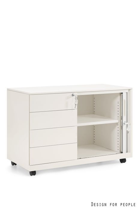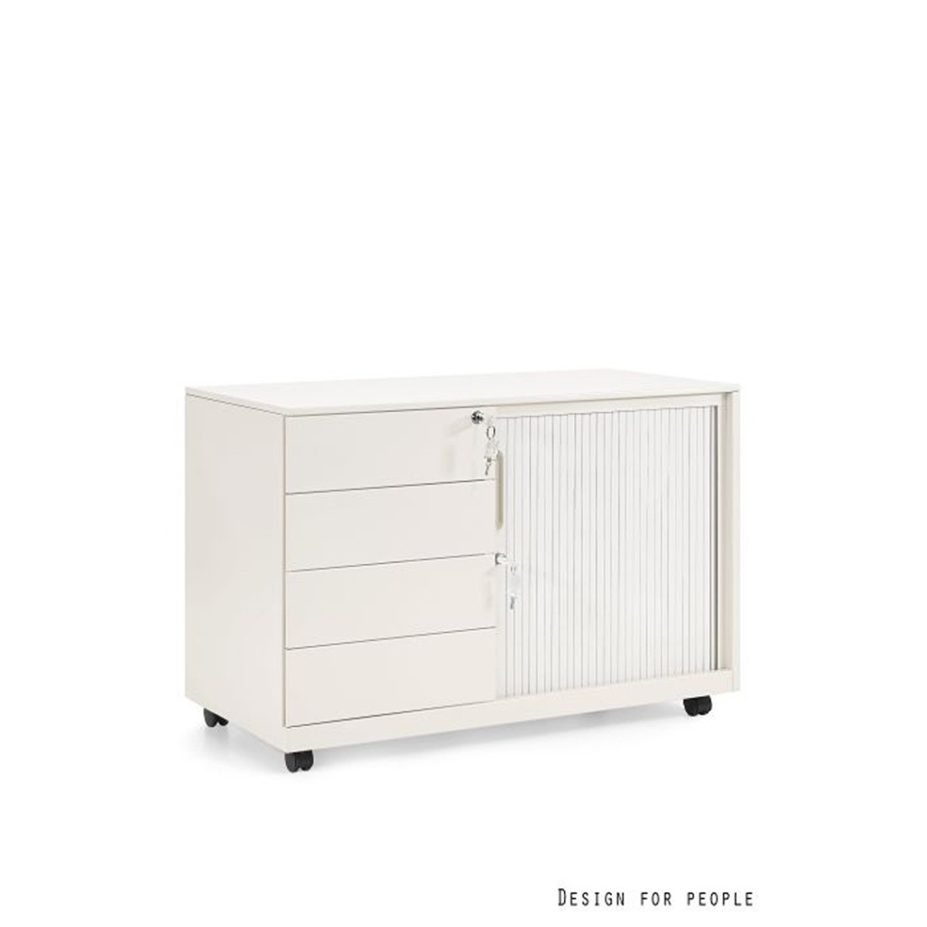 A szekrényrész tartós ABS műanyagból készült redőnyös ajtóval van felszerelve. Ez a megoldás rendkívül helytakarékos, mivel kinyitáskor nem igényel extra teret a szekrény előtt, így szűkebb folyosókon vagy kisebb irodákban is ideális. A szekrényrész természetesen biztonsági zárral védett.